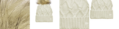 Totally on-trend, this women's beanie has a thick ribbed cuff and a cable knit crown that's topped off by a fun faux fur pom.