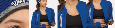 * Eco-Revive(r) product featuring 80% recycled polyester/20% polyester * Hanger loop label * Exterior faux leather logo loop label * Full zip * Front chest zippered pocket * Front zippered pockets * Spandex bound open bottom