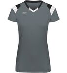 100% polyester wicking smooth knit with color secure(r) technology that helps prevent dye migration * Dry-Excel(tm) Micro-Interlock smooth 100% polyester knit inserts * Wicks moisture * Ladies' fit * Updated tailored fit * Tag-free label * Outside locker label * Modified V-neck collar * Designed to be NFHS compliant